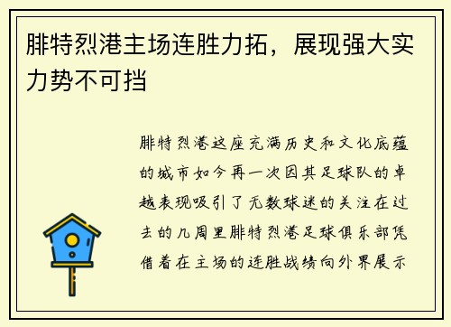腓特烈港主场连胜力拓,展现强大实力势不可挡