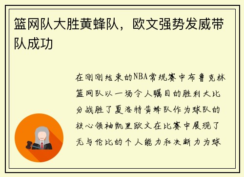 篮网队大胜黄蜂队,欧文强势发威带队成功